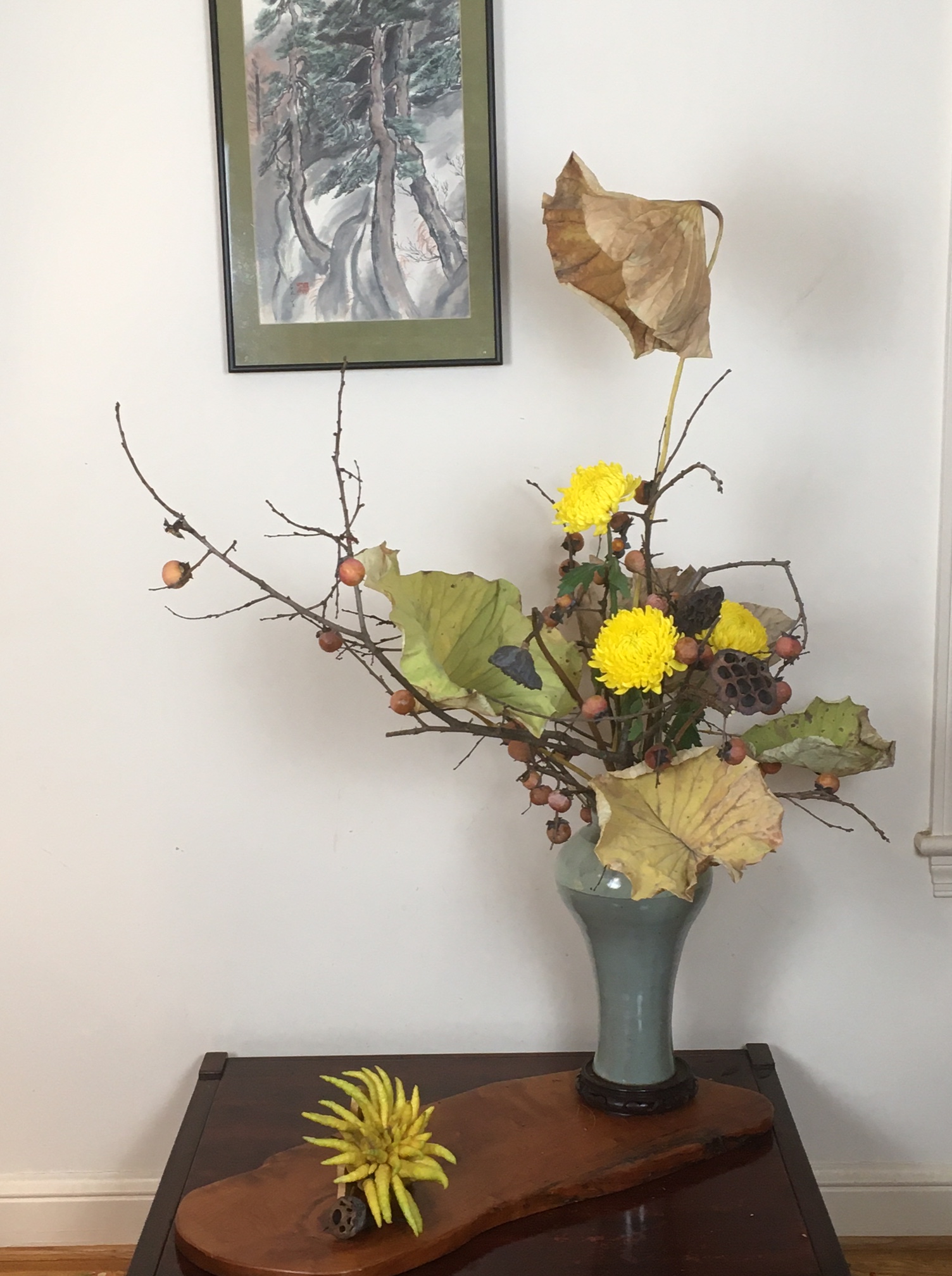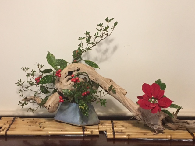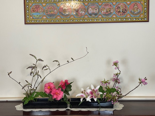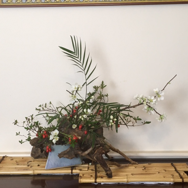Interestingly enough, Ikebana was also deeply influenced by the spread of Buddhism across Japan during the Asuka and Nara periods spanning 552-794 AD. Although Buddhist floral offerings were religious in nature and not decorative, the form in which temple offerings were made had great impact on the approach used by Ikebana for the presentation of plant elements. In fact the basic Buddhist triad image of a large Buddha flanked by two smaller ones was mirrored in the “three branch style” followed by all Ikebana schools. Eventually, the three-branch, asymmetrical scalene triangle became the basic form underlying the styles of most schools both classical and modern (From “Ikebana for Everybody,” Hiroki Ohara 2015).
