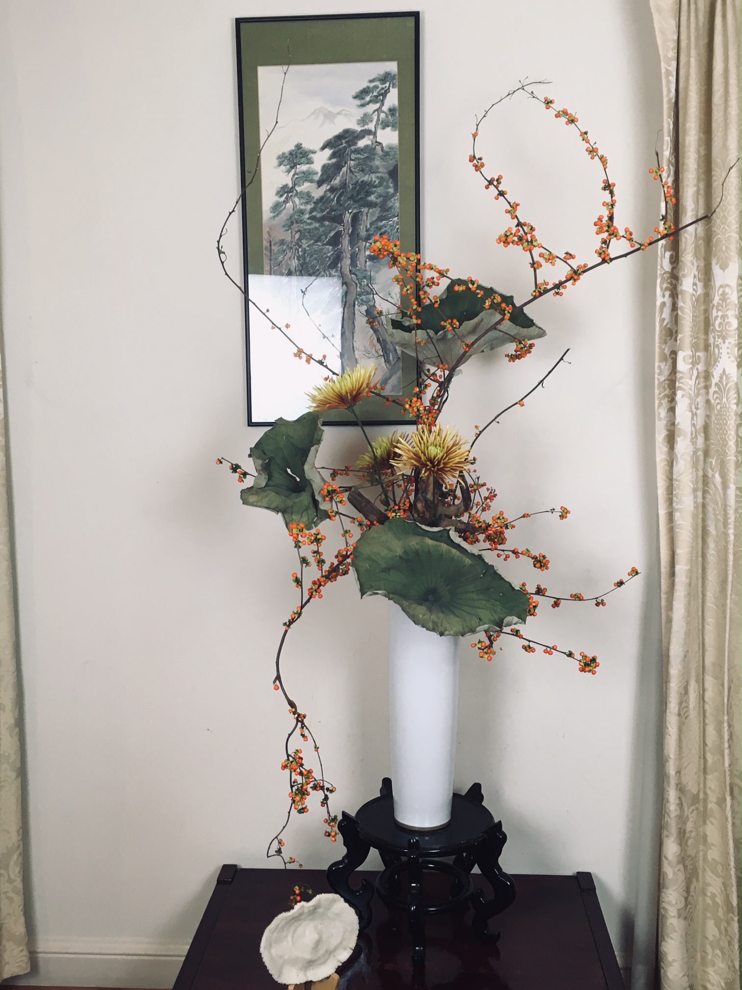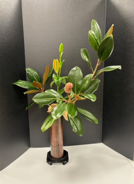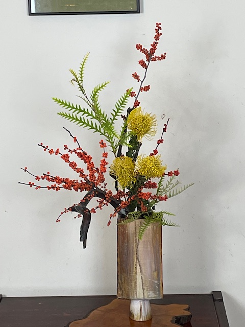 Ikebana is the art of appreciating nature through the arrangement of cut flowers, plants and branches. The tradition is over 600 years old and is ever evolving new ways to capture the natural beauty of the world around us in a small setting, such as a pottery container, that can be enjoyed indoors. In its drive to capture the transcendence of the natural world, Ikebana also seeks to incorporate the geographic diversity of our planet, the interplay between high mountains and the sea, and the ever changing seasons. At its most basic Ikebana is a display of cut flowers in a small container. However, despite the simplicity of the medium, Ikebana has developed over the centuries into a highly refined system of capturing the fullness and beauty of nature in a microcosm; and has branched into multiple schools each with a their own approach and structure of capturing the elements of nature (From the Mayu Ikebana Studio, 2022).