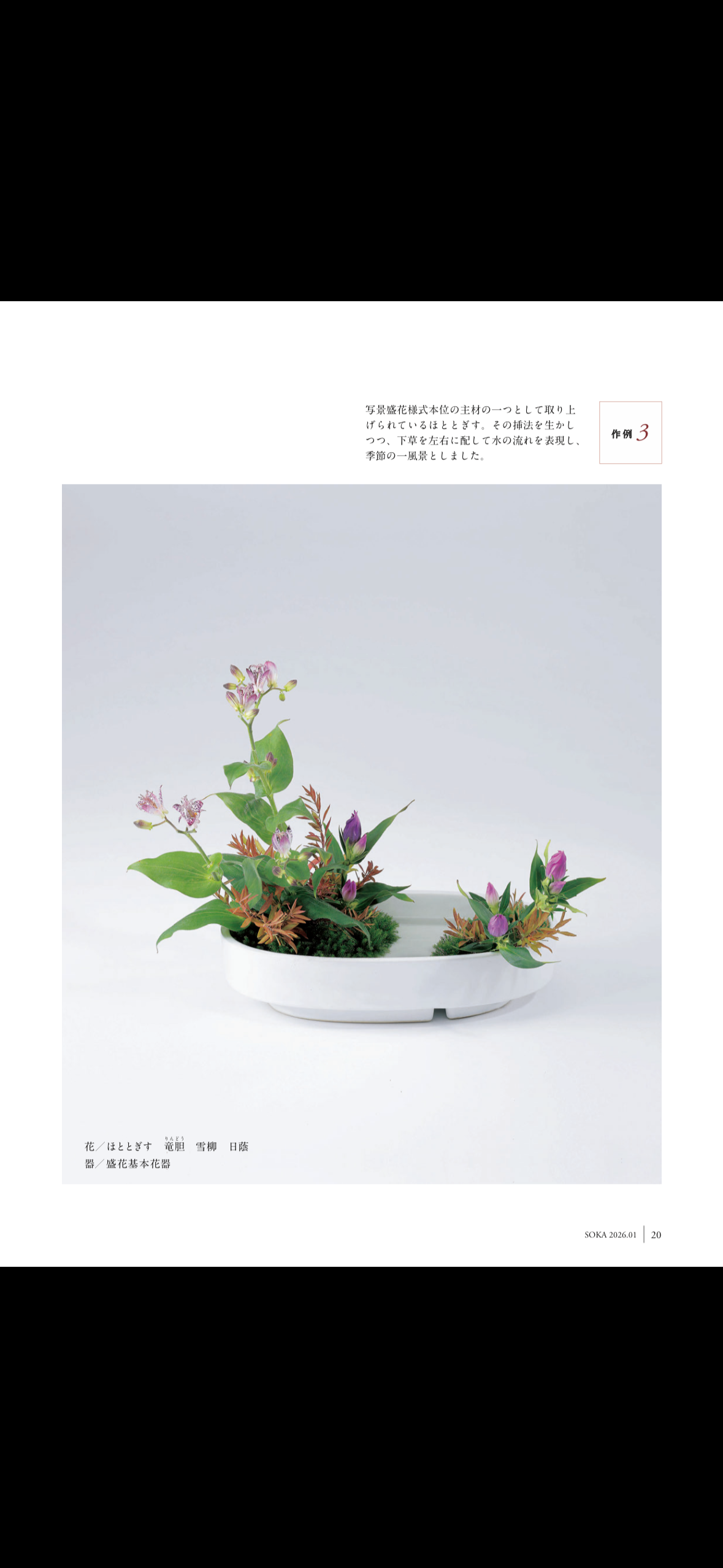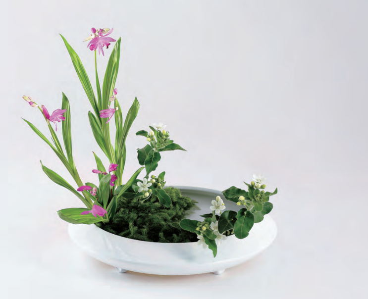 Ohara School is known for its focus on naturalistic styles and the use of seasonal materials. The school was founded by Unshin Ohara (1861-1916, pictured below). He often explored the fields and mountains and tried to develop a style of Ikebana to express the beauty of natural scenery. He also searched for ways to arrange the colorful Western flowers that had just begun to be imported into Japan at that time. The result of his efforts was Moribana, which is a style of arrangement using a shallow container and hanadome (weighted flower holder). Today, the school is led by the young Fifth Headmaster Hiroki Ohara. Ohara School’s curriculum covers traditional styles to more modern styles. To see more pictures of Ohara arrangements, please click here.