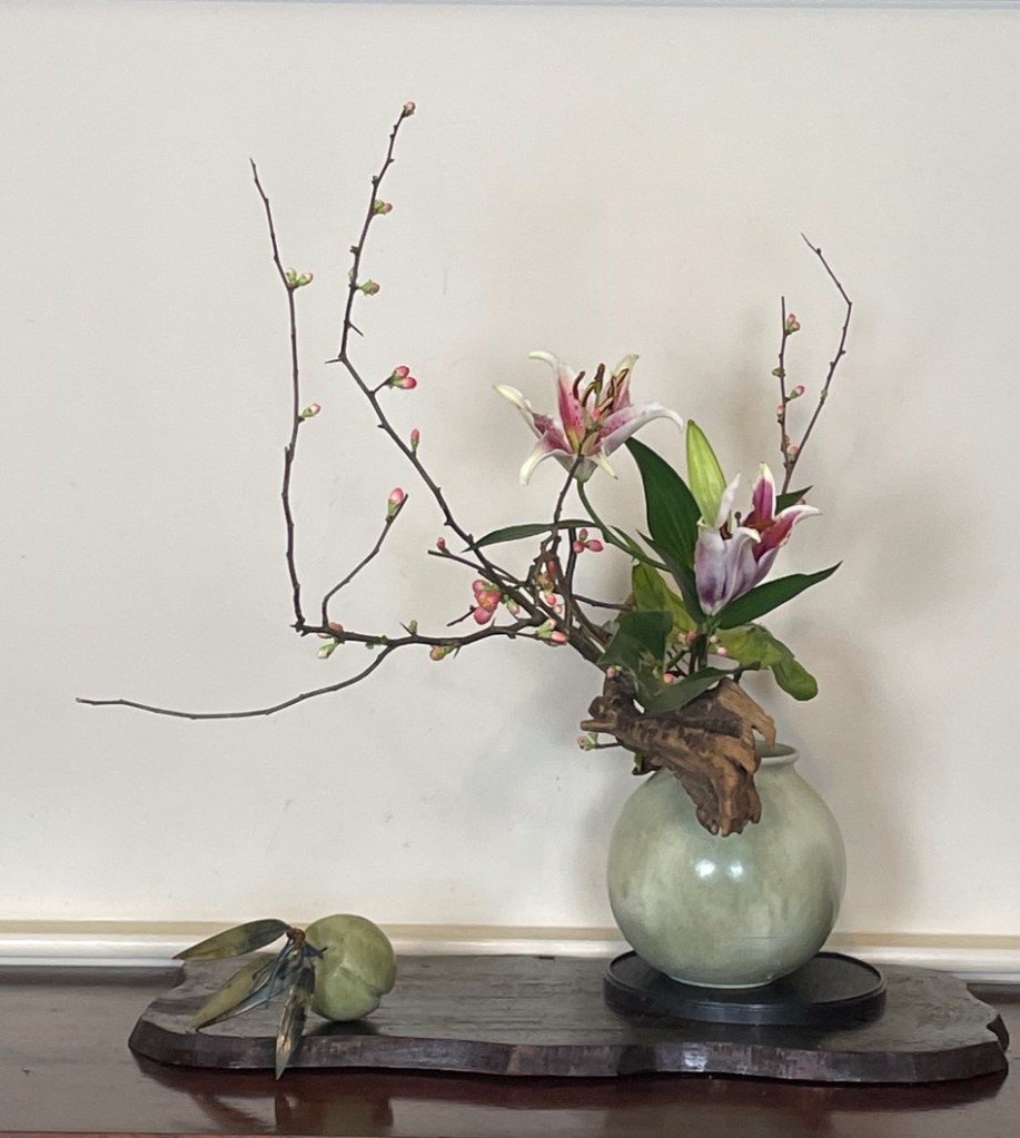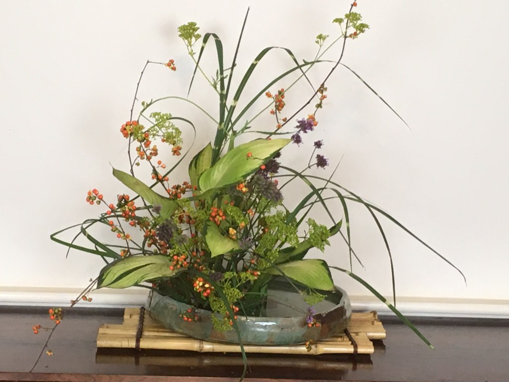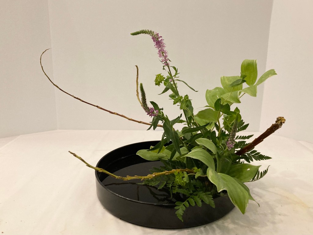 Ikebana is the art of appreciating nature through the arrangement of cut flowers, plants and branches. The tradition is over 600 years old and is ever evolving new ways to capture the natural beauty of the world around us in a small setting, such as a pottery container, that can be enjoyed indoors. In its drive to capture the transcendence of the natural world, Ikebana also seeks to incorporate the geographic diversity of our planet, the interplay between high mountains and the sea, and the ever changing seasons. At its most basic Ikebana is a display of cut flowers in a small container. However, despite the simplicity of the medium, Ikebana has developed over the centuries into a highly refined system of capturing the fullness and beauty of nature in a microcosm; and has branched into multiple schools each with a their own approach and structure of capturing the elements of nature (From the Mayu Ikebana Studio, 2022).
