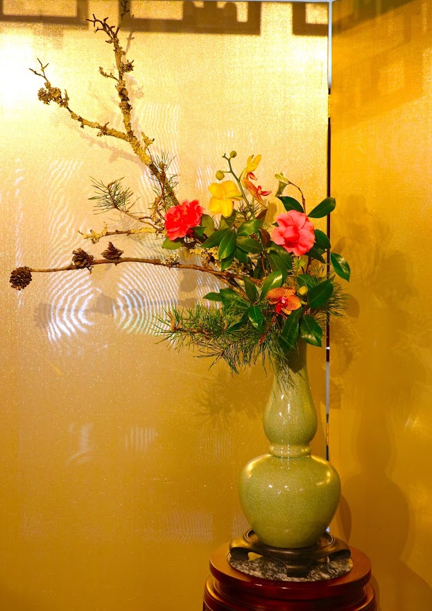 Previous Image Next Image 2019_naae_holley-green_bunjin Holly Green: Ohara Bunjin style.Materials: lichened branch, camellia, orchid, pine.