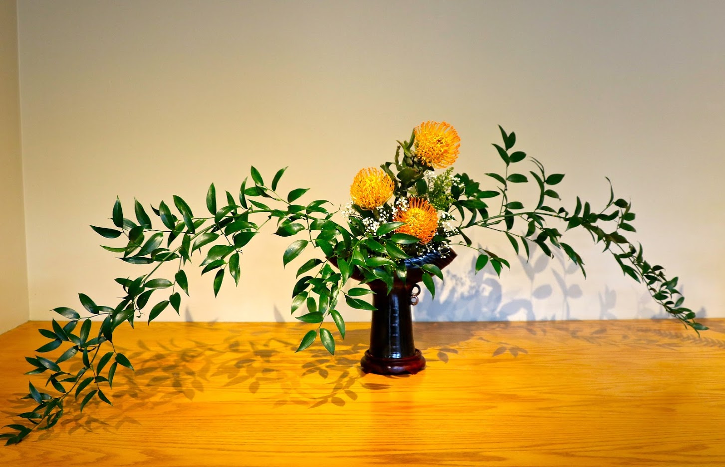 Previous Image Next Image 2019_naae_yuko-wain_radial Yuko Wain, Ohara Radial Style.Materials: Italian Ruscus, pincushion protea, solidago, gypsophila.